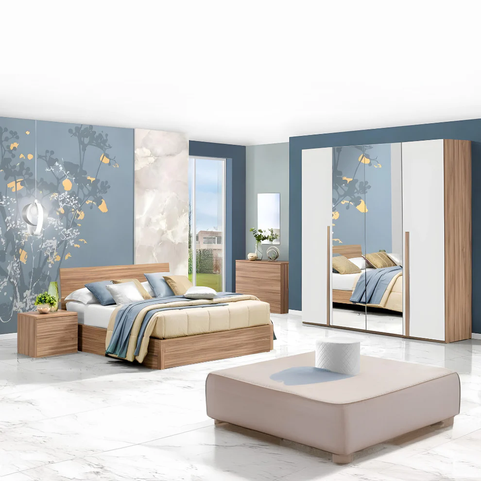 - الغرفة مكونة من سرير مع دولاب وتسريحة ومرايا وكومود